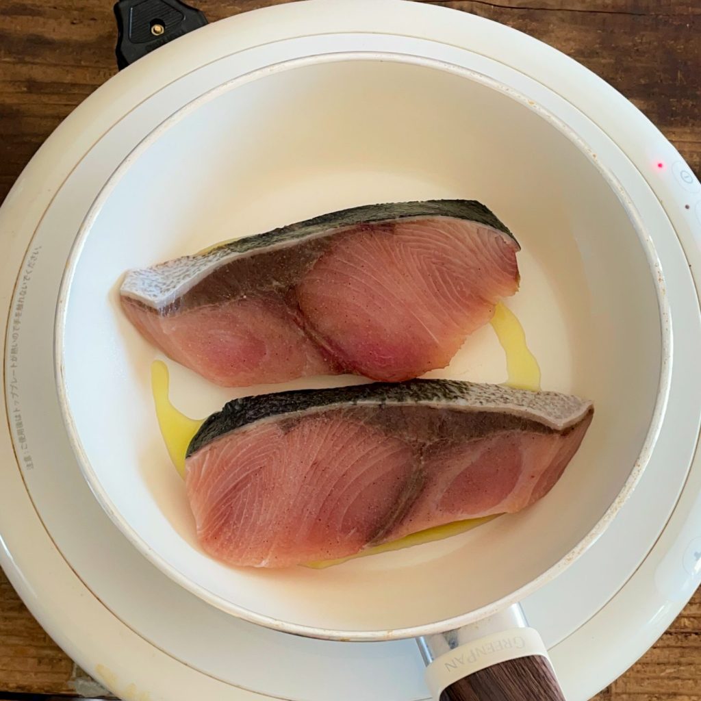 フライパンにオリーブオイルを中火で熱し、ブリを両面焦げ目がつくまで焼く。