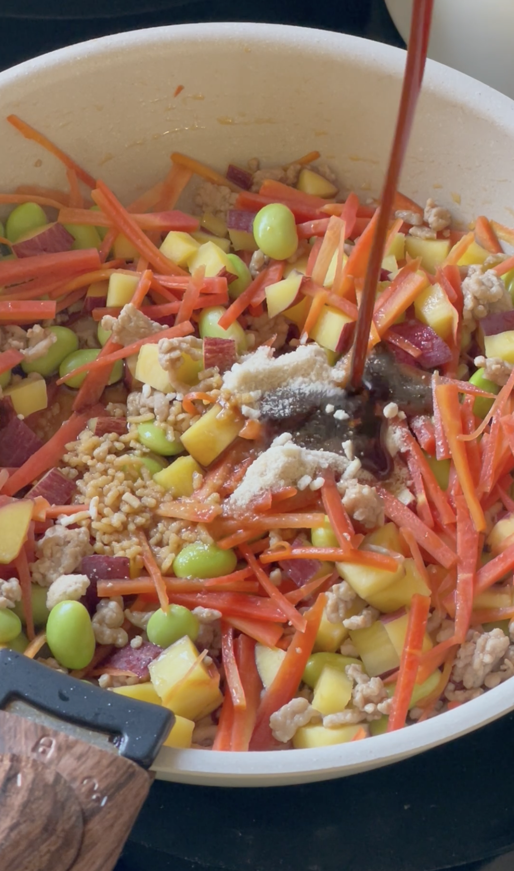 2、フライパンにごま油を熱し豚ひき肉を炒める にんじん、さつまいも、しめじ、むき枝豆を加え さっと炒め合わせて 一度火を止め<A>とを加えて再び中火で炒め合わせる