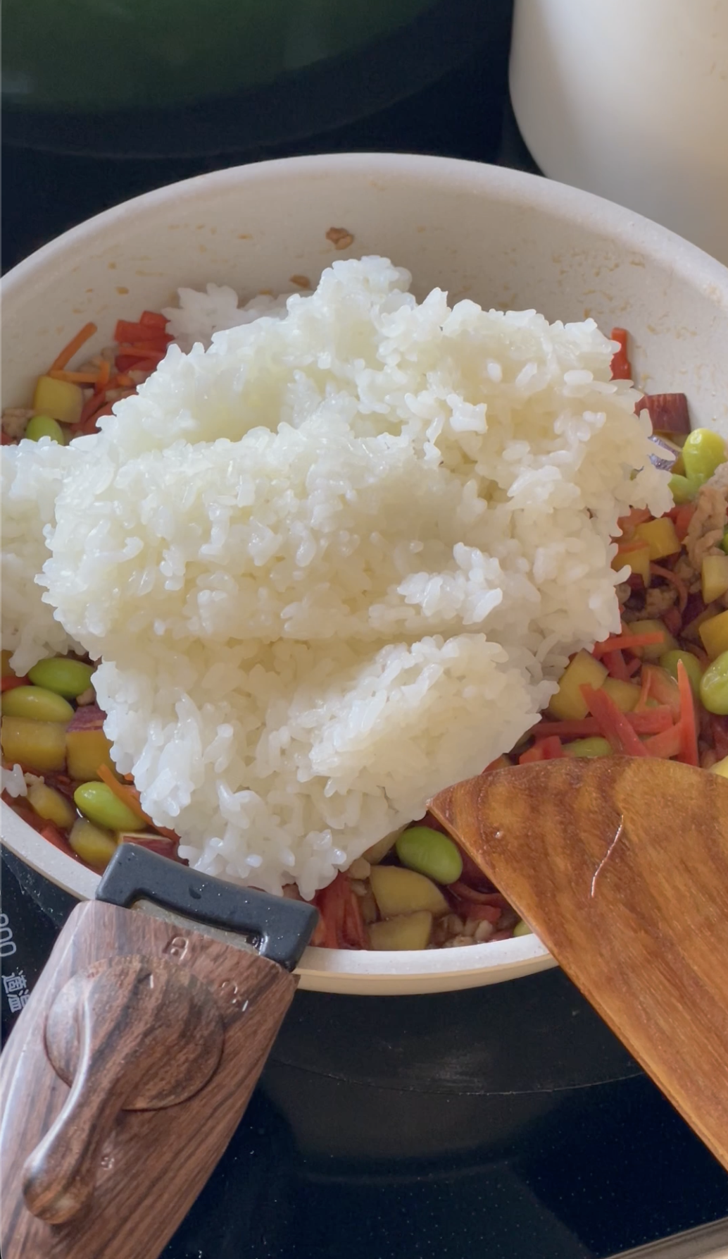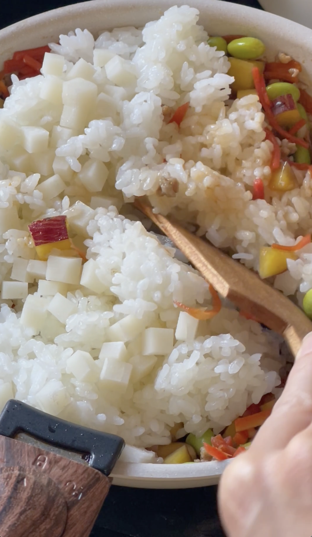 3、ごはんと餅を加えて合わせて混ぜる