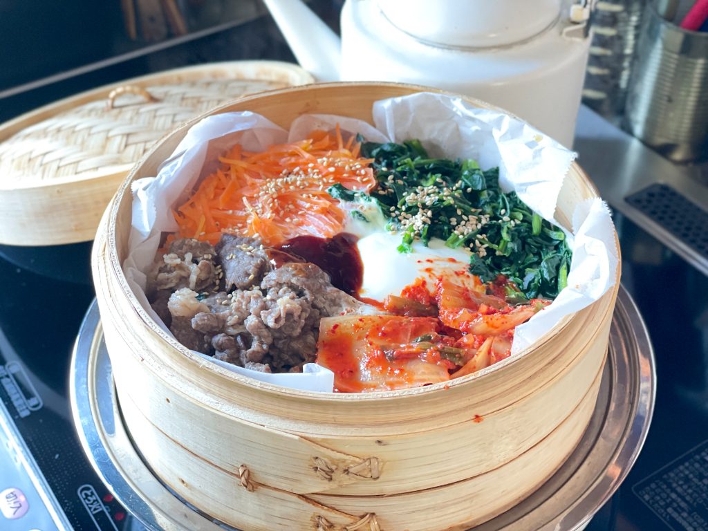野菜も肉も卵もごはんも、一発調理蒸篭におまかせでビビンバ作りました。