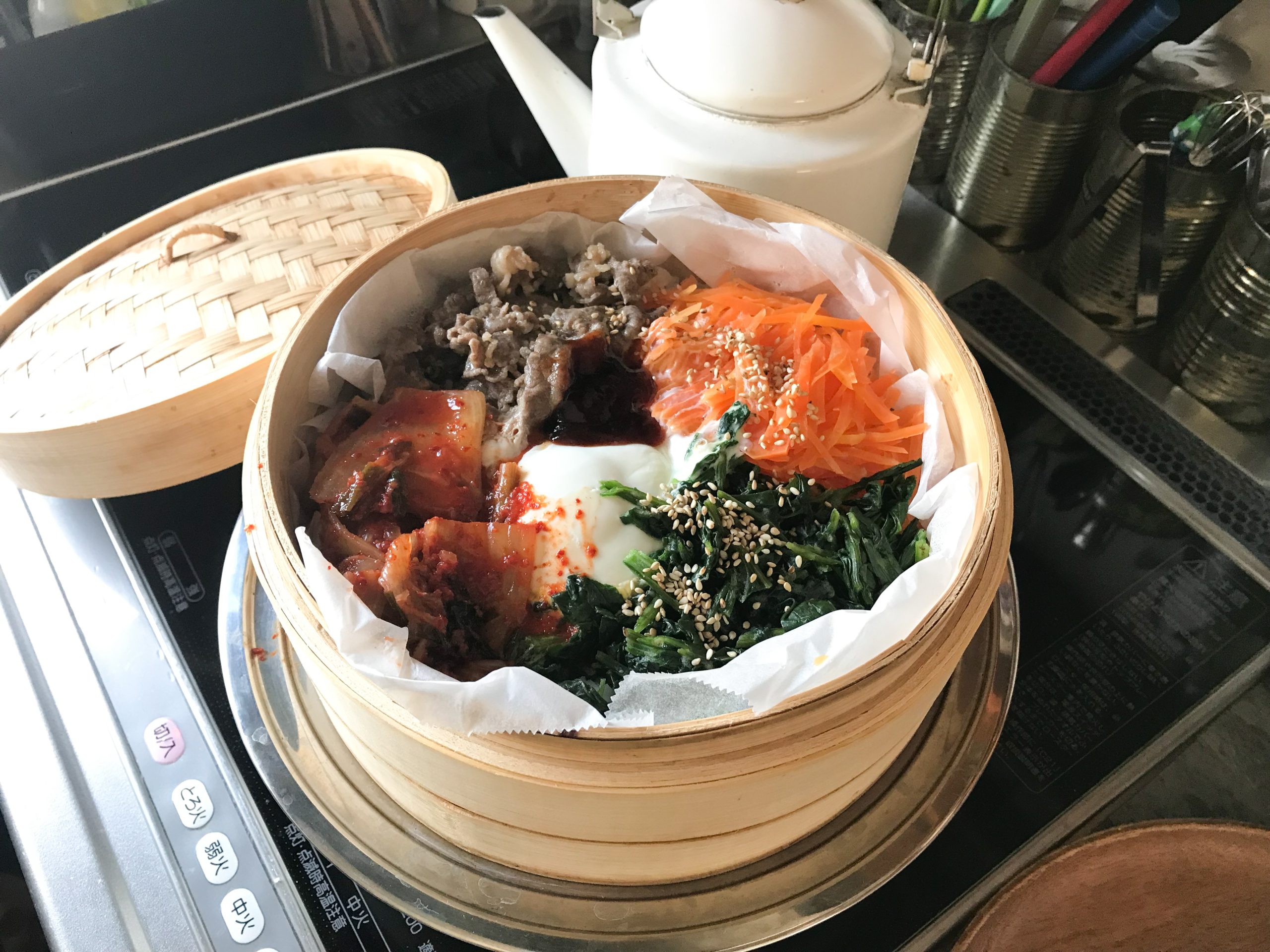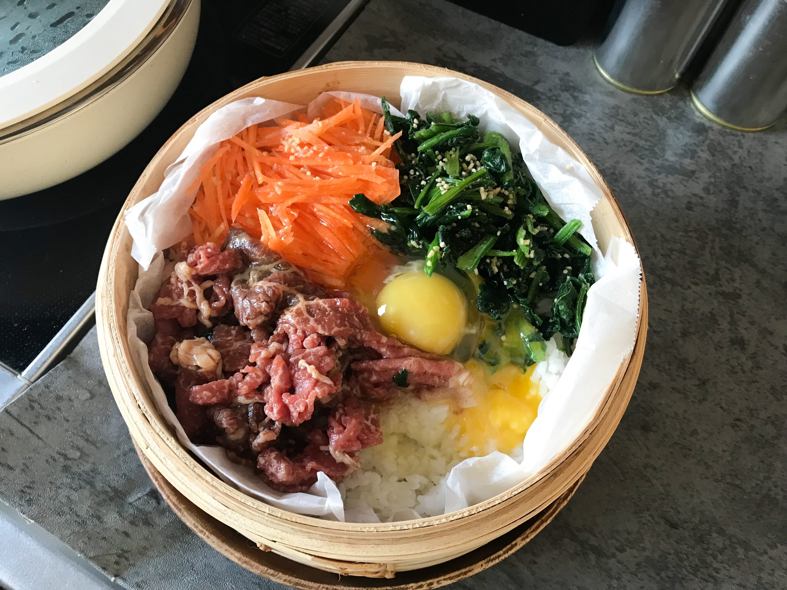 野菜も肉も卵もごはんも、一発調理蒸篭におまかせでビビンバ作りました。
