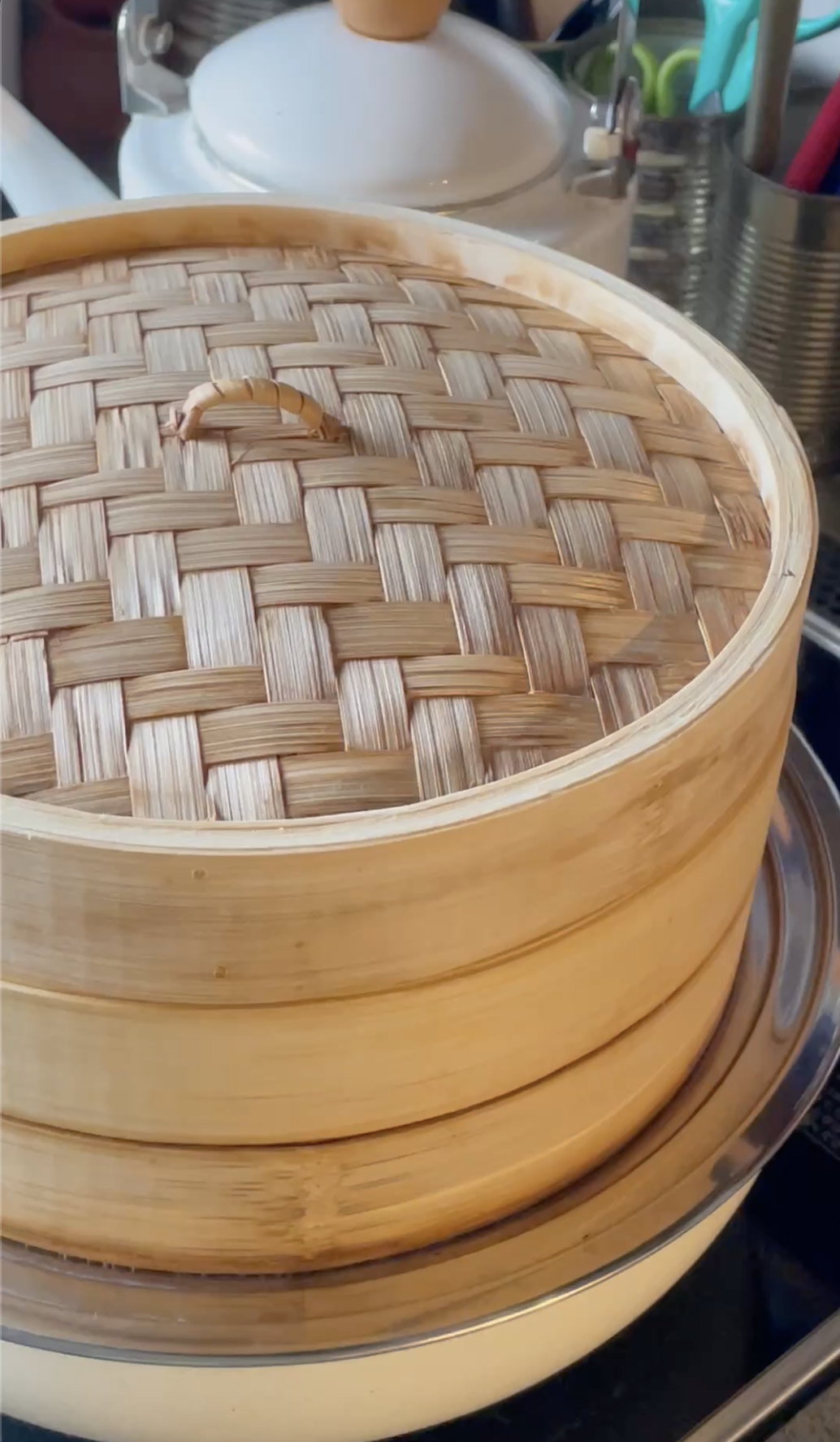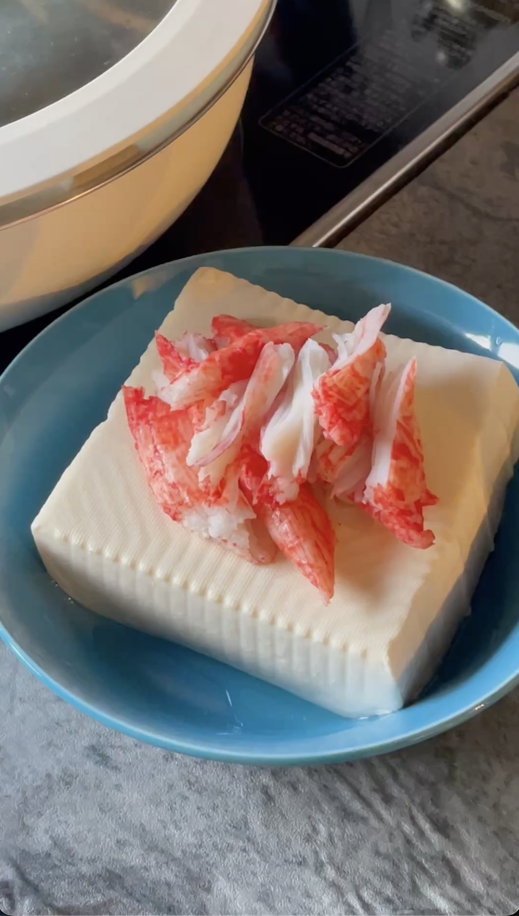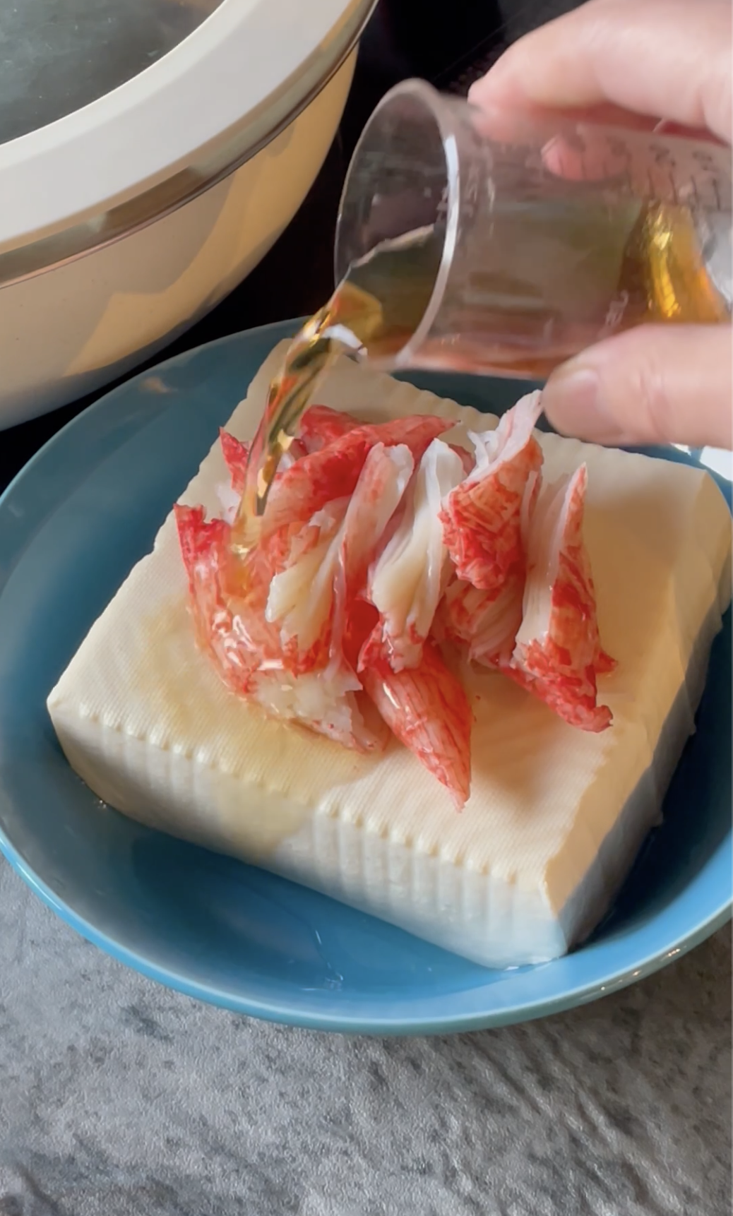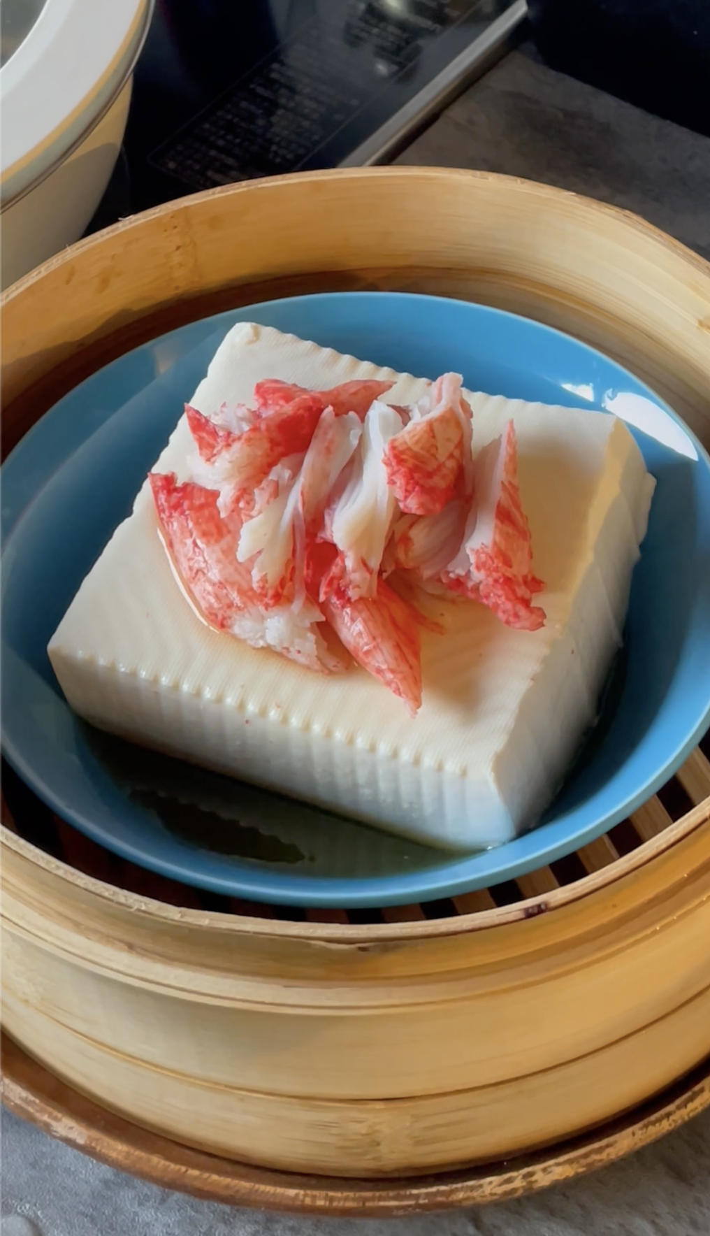 せいろに入れ、強火で5分蒸します。豆腐が芯まで温まり、カニカマの香りが立ったら完成です!