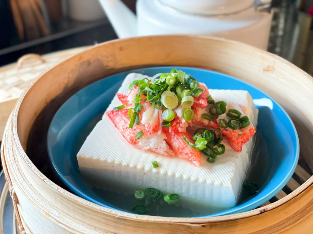 【豆腐+カニカマ】をのせて白だしをかけて蒸篭で5分蒸すだけ。