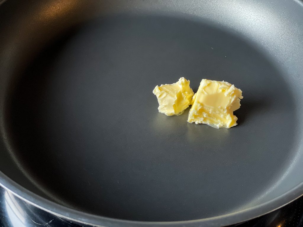 フライパンにバターを熱し、タケノコを加えて中火で炒めます。