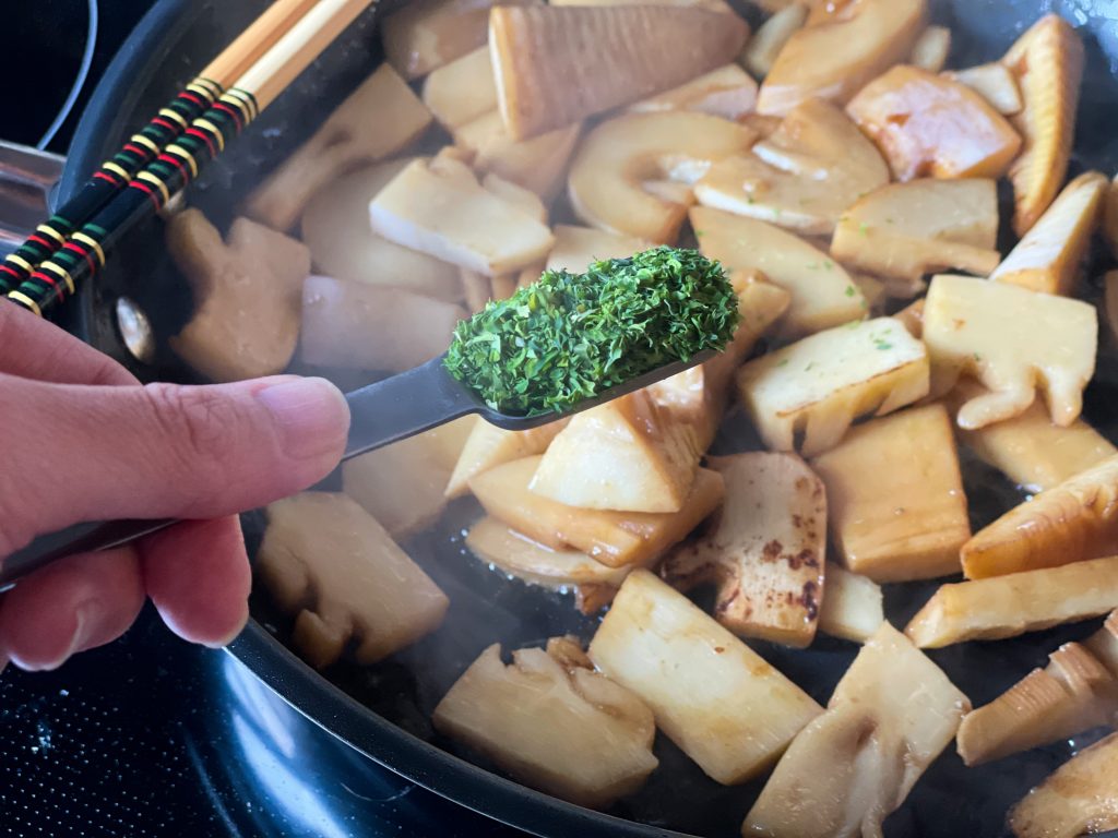 醤油を回し入れ、全体に味が絡んだら、青のりをまぶします。