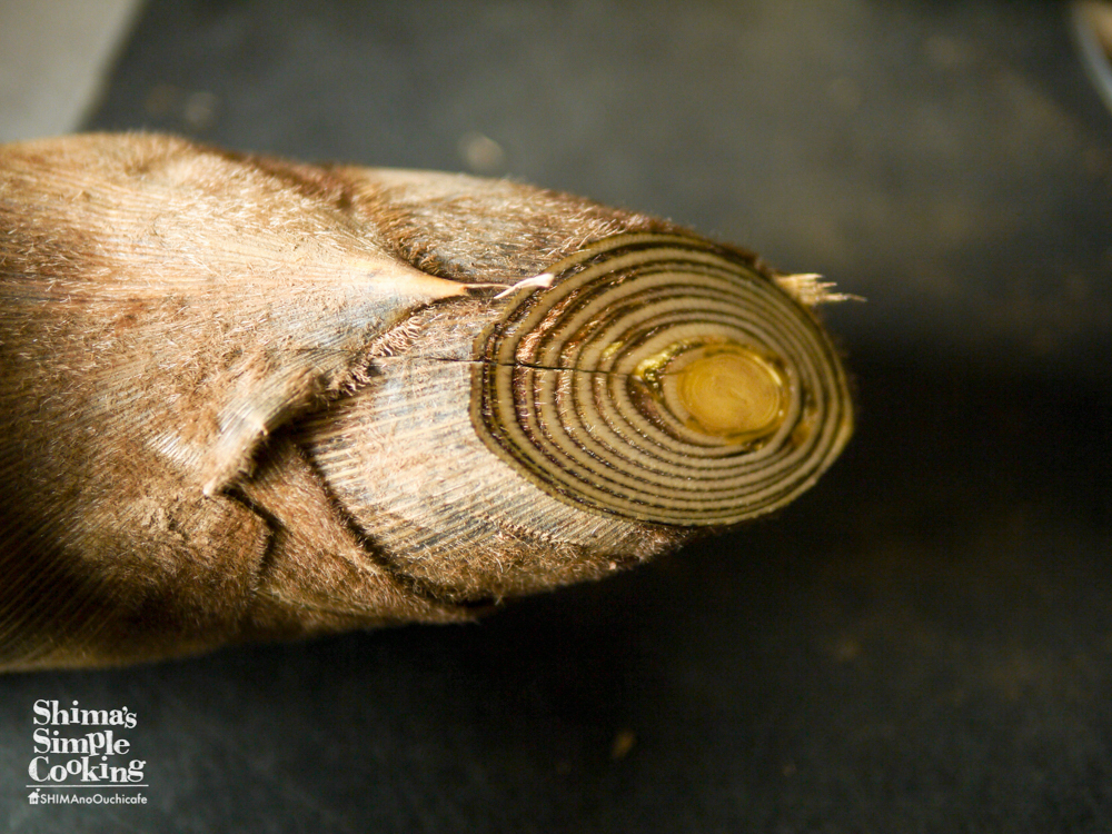 筍は洗って穂先を斜めに落とし、縦3センチくらい先端に切り込みを入れます。