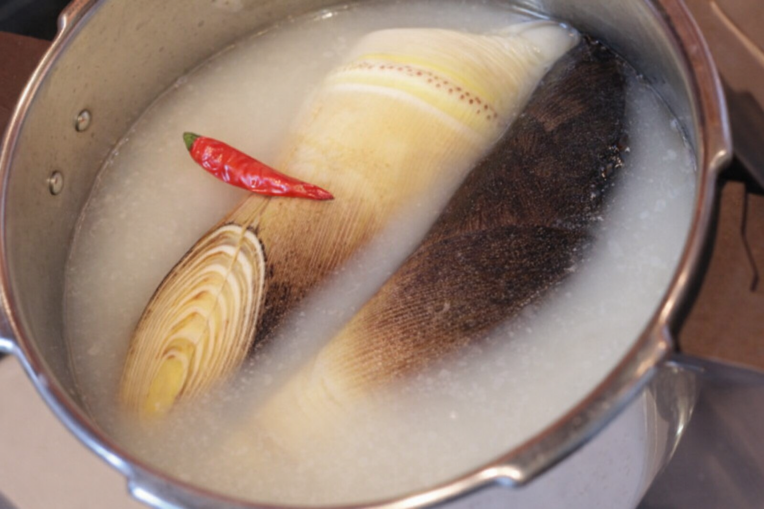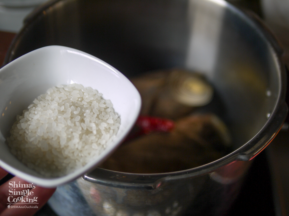 下ごしらえした筍と、米、唐辛子、水を圧力鍋に入れます。蓋をして火にかけ、加圧します。