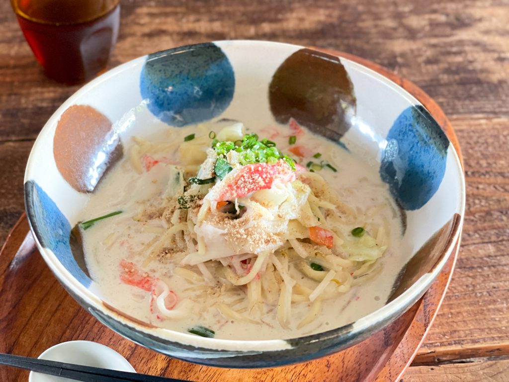 スープが一煮立ちしたら、塩こしょうで味を整えます。ちゃんぽん麺とカニカマを加え、麺に火が通るまで加熱すれば完成です!