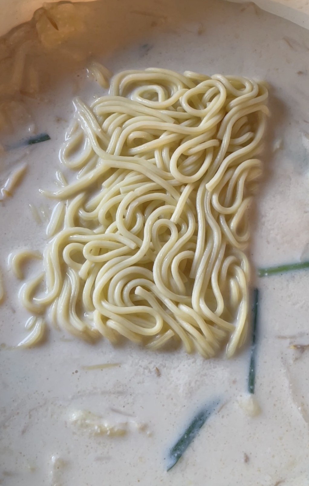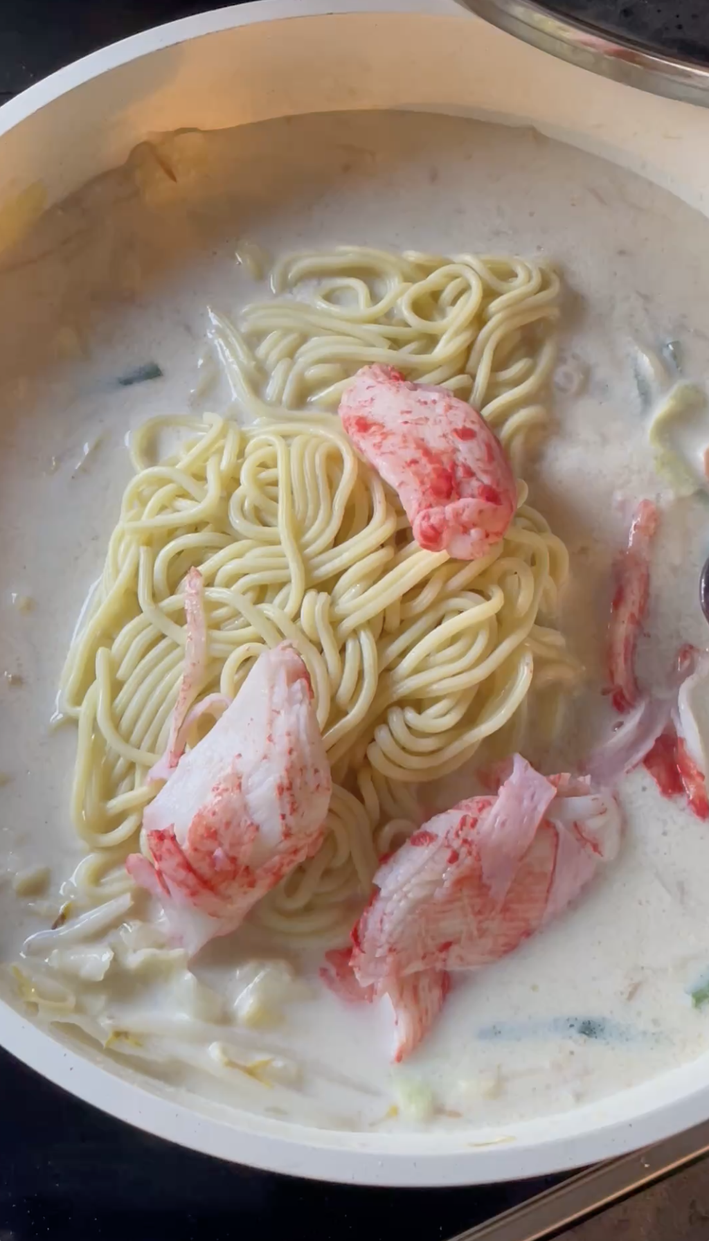 スープが一煮立ちしたら、塩こしょうで味を整えます。ちゃんぽん麺とカニカマを加え、麺に火が通るまで加熱すれば完成です!